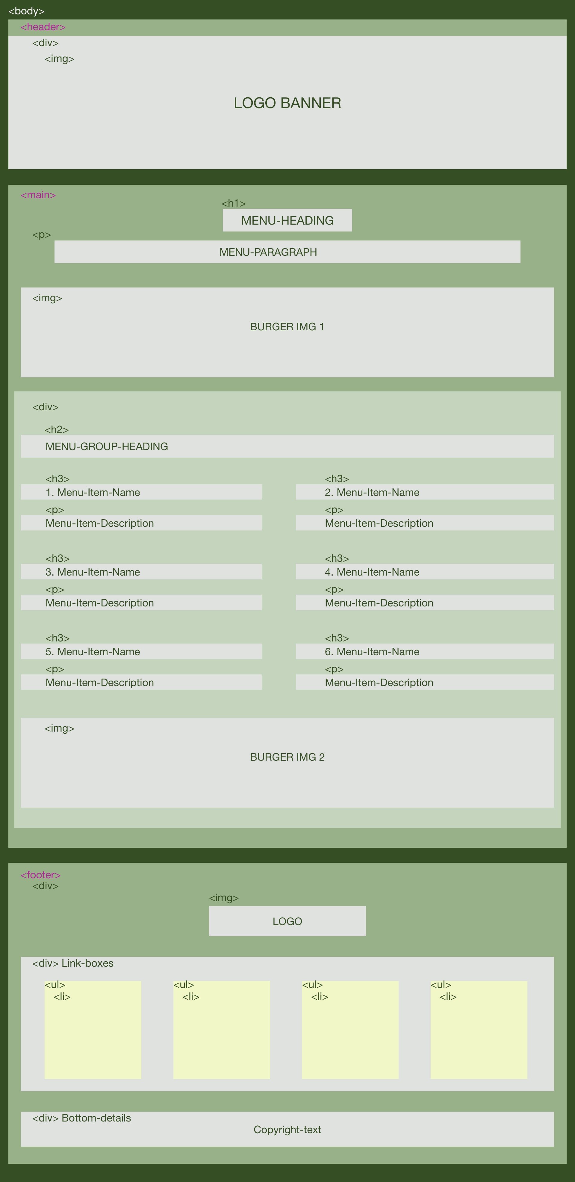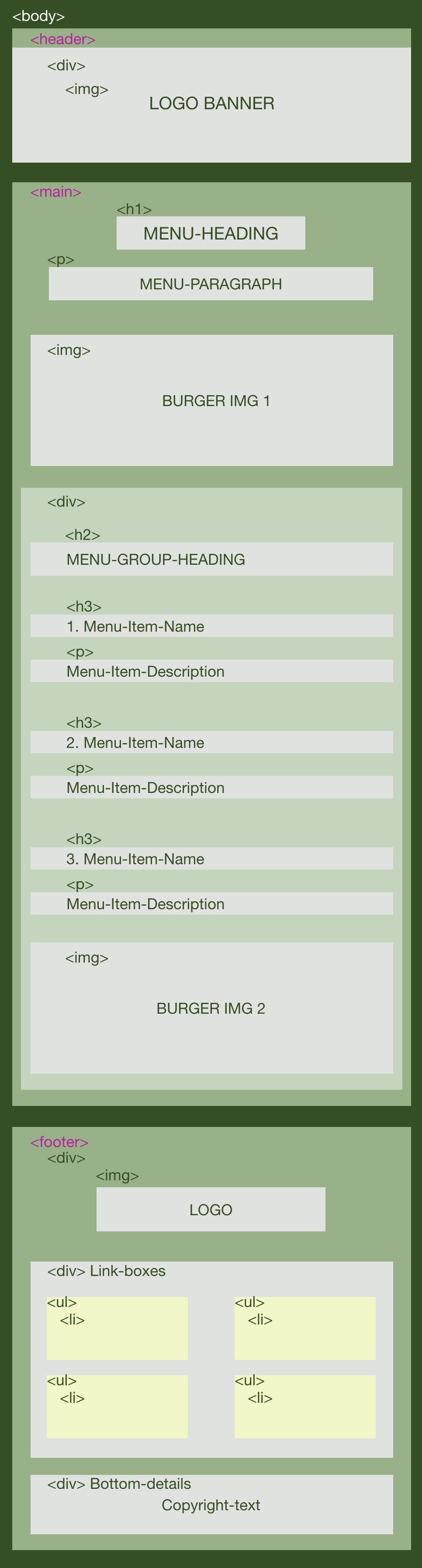Here is the prototype (computer version). Inside <body> section contents <header>, <main> and <footer>. Compared to the wireframe version, this prototype helps me have a clearer overview of the web structure before coding and styling css.