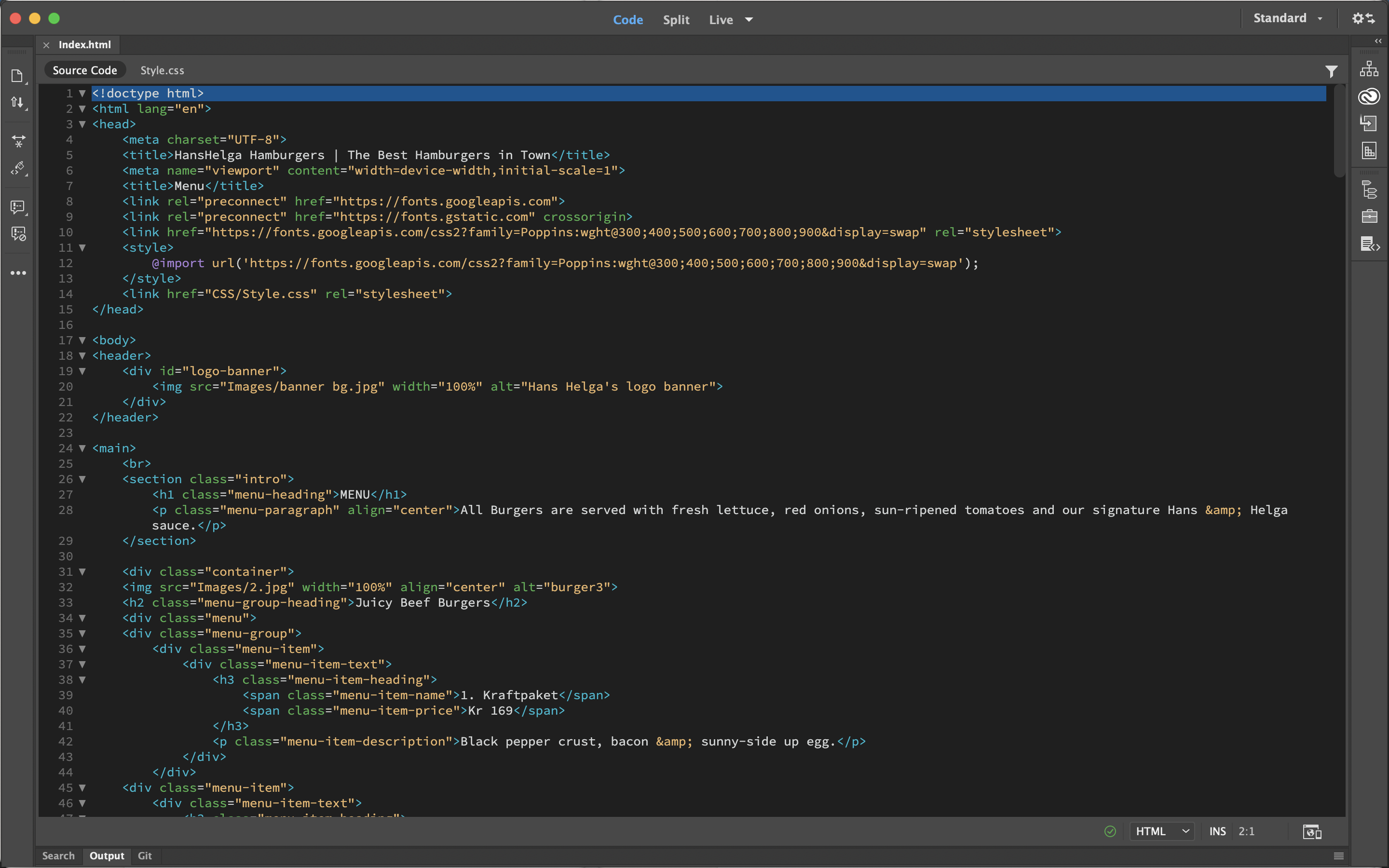 This project is about branding and creating a website that serves as an online menu for Hans Helga Burgers – a restaurant specializing in burgers. The website will be coded from scratch using HTML and CSS.