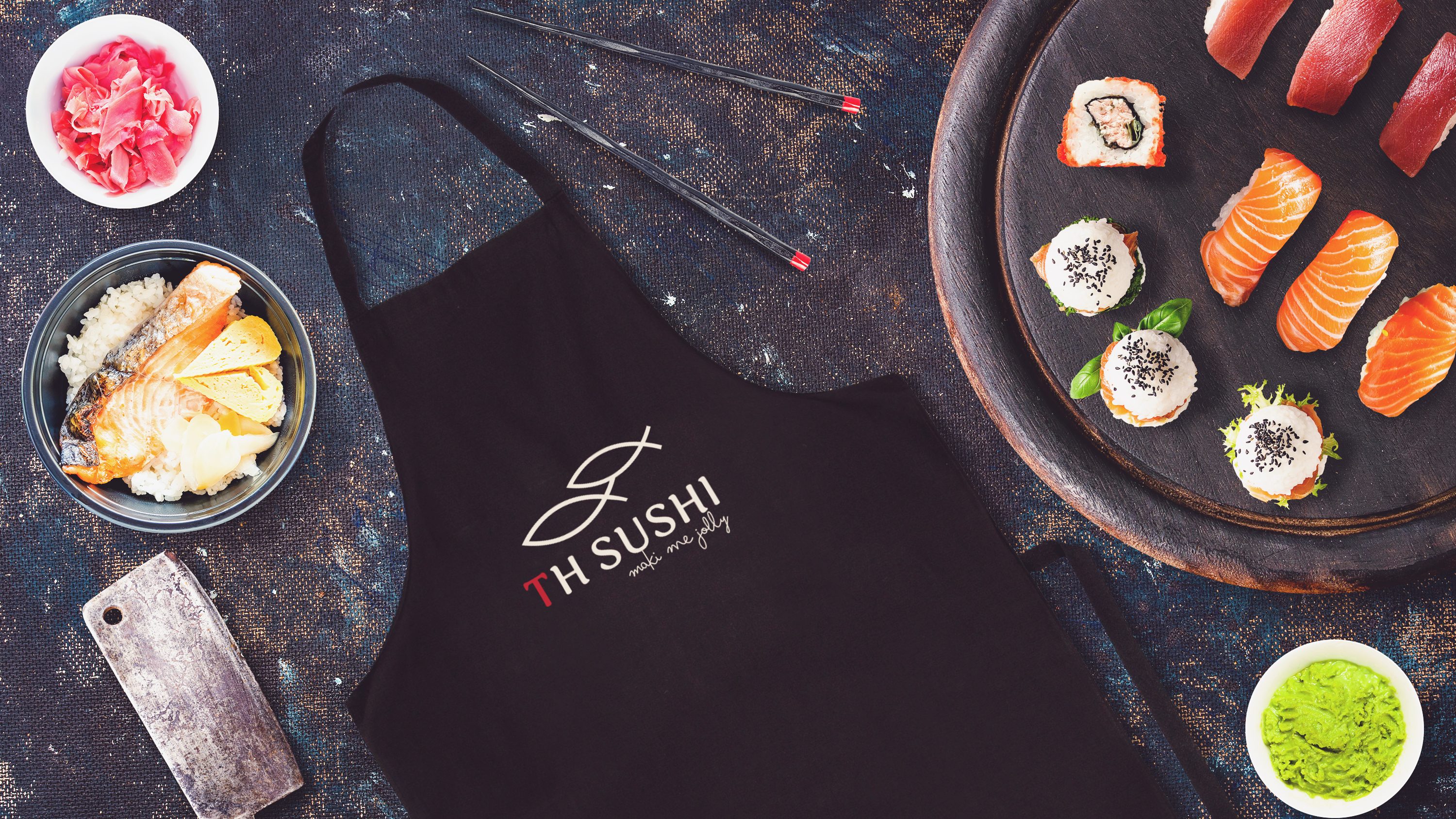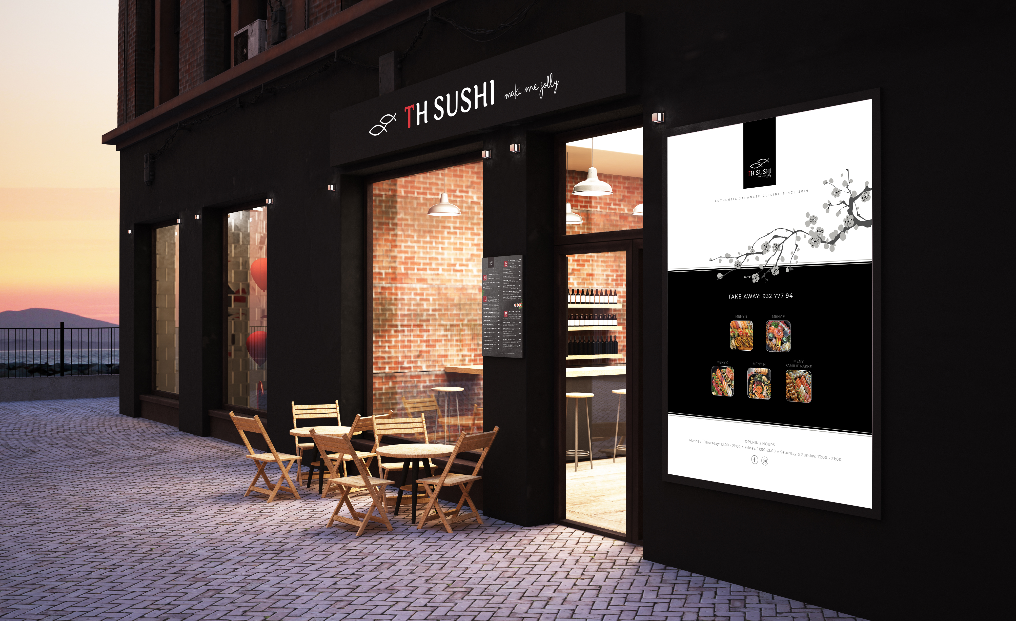 The slogan “maki me jolly!” from the original “make you happy!”. At TH SUSHI, always make customers feel satisfaction, comfort and enjoyment when they visit the restaurant. The word “maki” is the name of the traditional sushi roll. This is also a popular pun in advertising design.